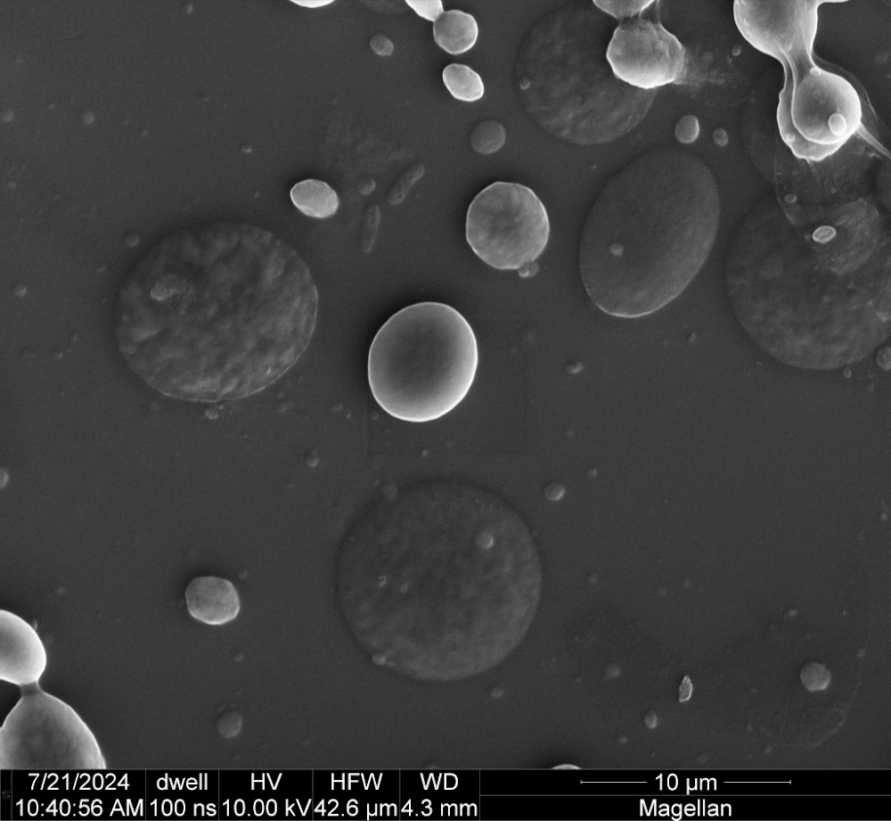 I think the image on the left shows a clump of silk spheres still stuck in a flake of undissolved PVA. The image on the right shows some isolated silk spheres (the bright egg-looking structures, such as in the near center of the frame) together with what I think must be some spheres that collapsed into silk pancakes (the dark/gray lumpy round blobs, such as just below and to the left of the bright egg). In the image on the right you can see what appear to be a very broad range of sizes of silk spheres, with the central bright egg looking like ~5-7 microns in diameter and some of the things that appear just as round specks (assuming they are in fact smaller spheres) well below 1 micron in diameter.