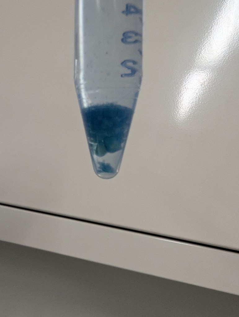 One promising early experiment we did was to check whether it was possible to indigo-dye silk hydrogel. Just scooping some globs out of a tube of silk fibroin solution that had gelled on its own (“expired”), it worked just to immerse those in a small tube of indigo dyeing solution (indigo pigment reduced to water-soluble form using fructose as the reducing agent and sodium hydroxide as the base) for ten minutes, then rinsing several times with water.