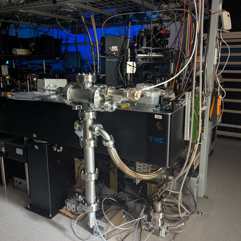 Somewhat as a reaction to experiencing the mechanical fragility of the indigo thin films fabricated by ultrasonic spraying, I gathered together some vacuum equipment from around the lab to kludge together a rudimentary thermal evaporator. My hope was that an evaporation-deposited thin film of indigo might be more durable…