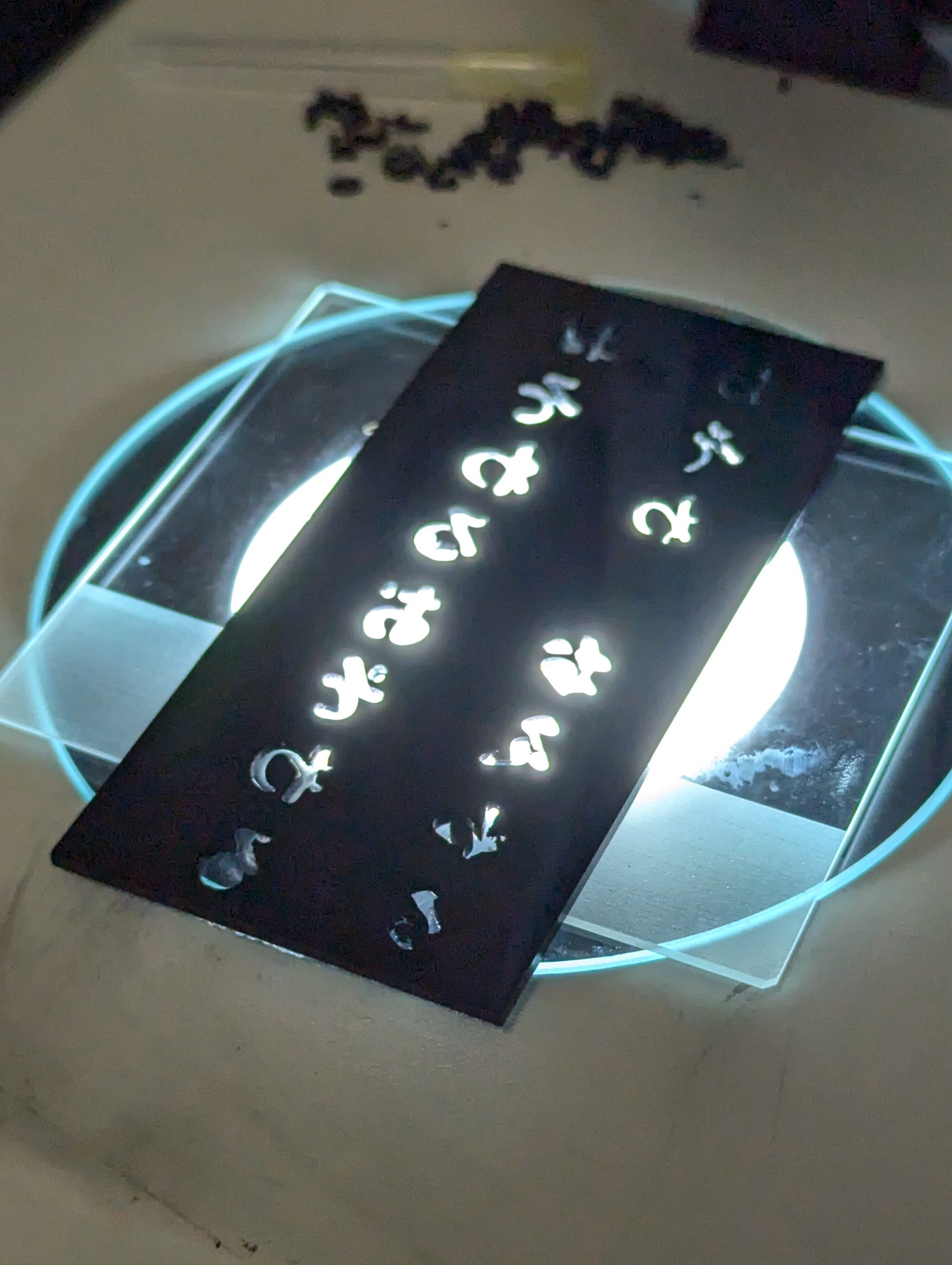 I turned to an alternative strategy of trying to laser-cut characters directly out of dried silk fibroin. The following photo shows the result of pouring silk fibroin solution into a glass dish, letting it dry out, and then cutting character forms directly in the laser cutter with varying speeds and powers: