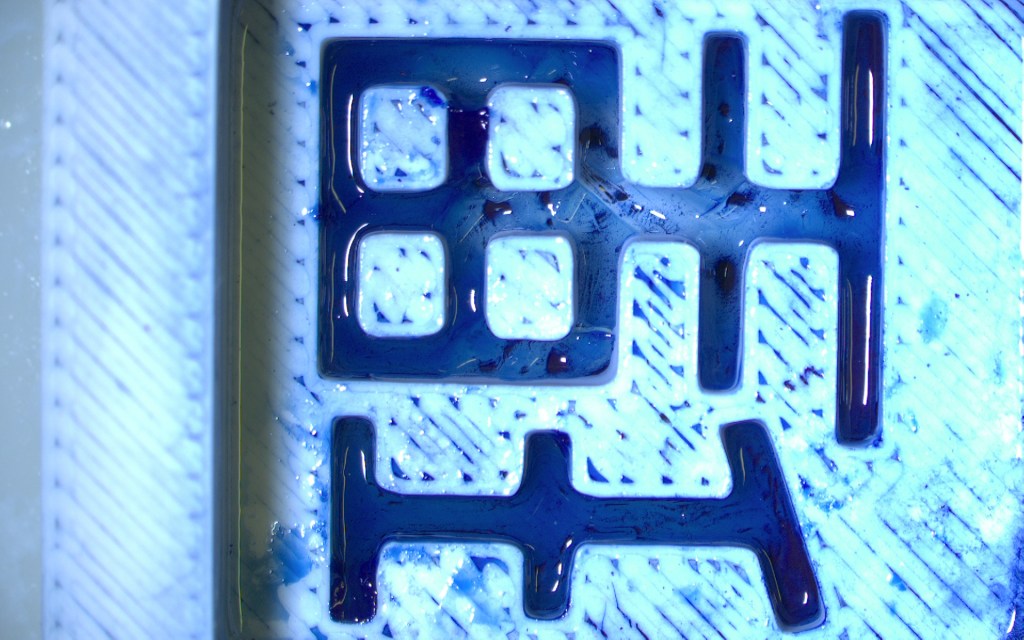 - Mix dyed hydrogel chunks (+gold?) in optical resin; fill kanji forms