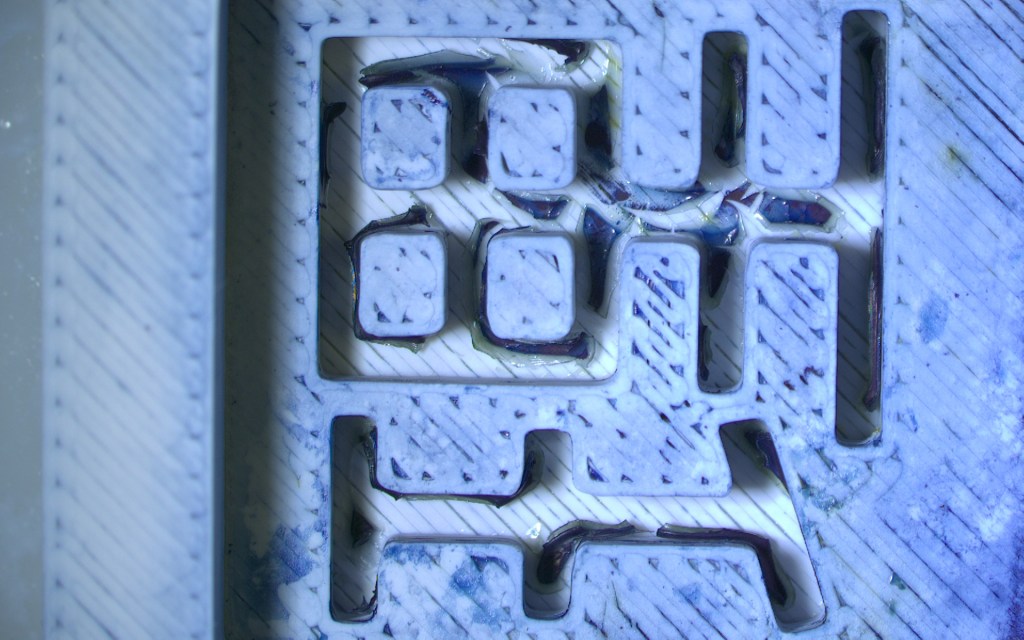 - Mix dried dyed hydrogel chunks (+gold?) in optical resin; fill kanji forms