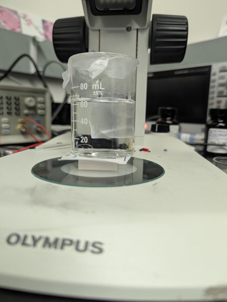 - SF hydrogel seems to have taken in the brown liquid (Olympus stereo zoom photo taken; no liquid remained under the parafilm cover ~1pm Wednesday) but now not sure the stock solution still had much leuco-indigo. Stirring now in a beaker of DI water to see what happens, might need to try dyeing again after regenerating the indigo stock solution…