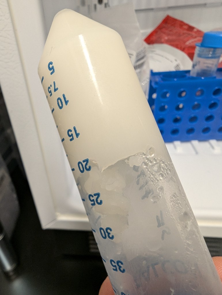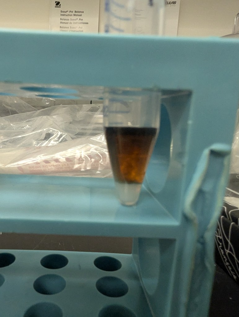 - Used pipetter to gently deposit a bead of concentrated SF in the very bottom, trying not to mix it with the methanol (in future don’t do the final pipetter plunge)