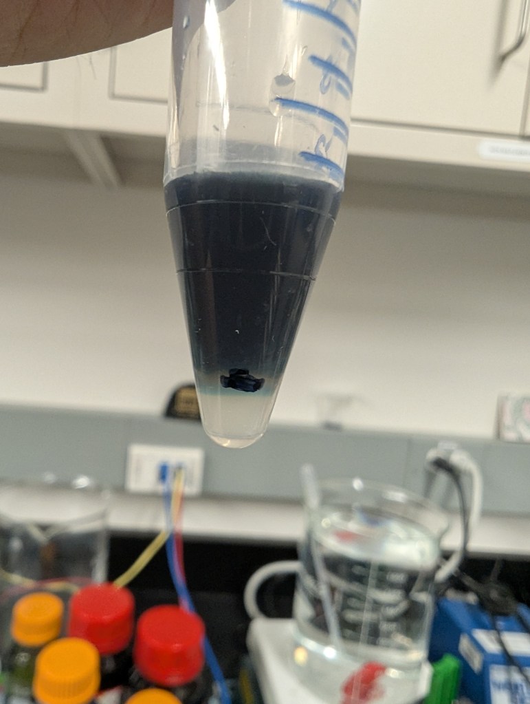 - ~2:15pm indigo stock now seems better – injecting into DI does immediately turn blue – letting some blue water settle overnight to see what it looks like tomorrow (took cell phone photo)