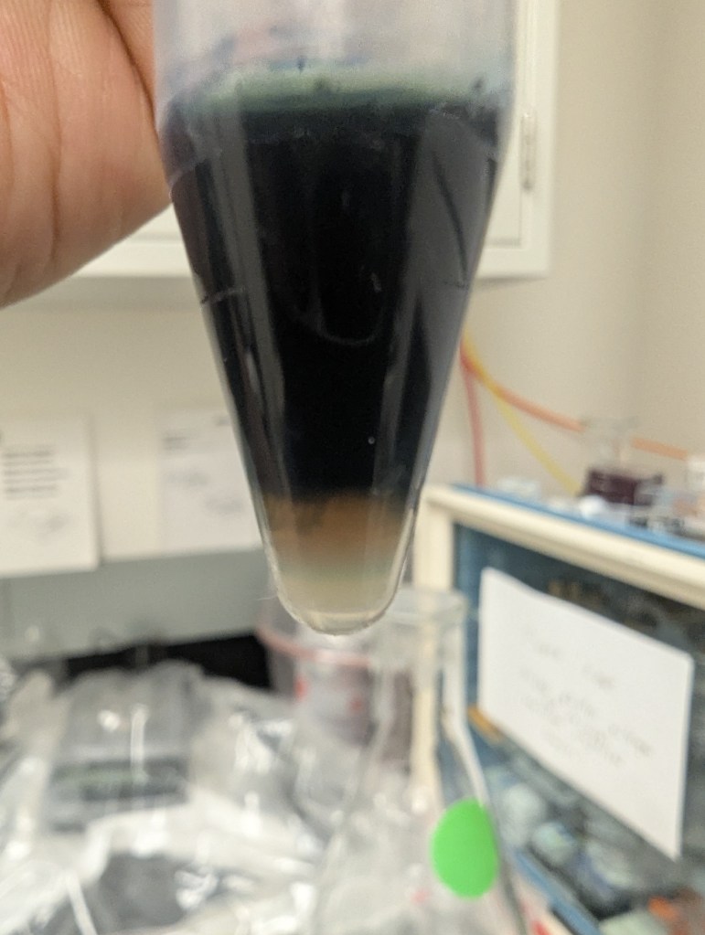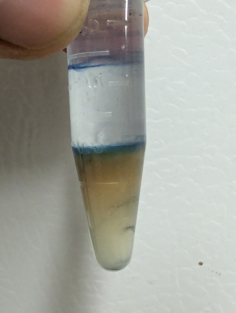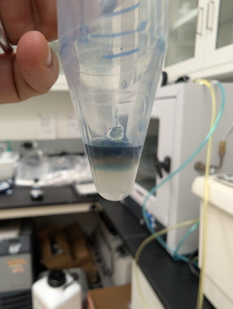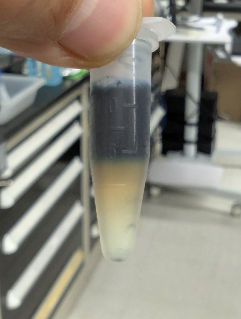 - Used pipetter to try to skim off indigo sup, leaving what might be settled SF solution at the bottom