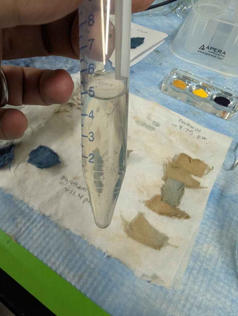 - Changed indigo 4 times then left overnight in still beaker of DI water (weighed down with stir bar, facing up)