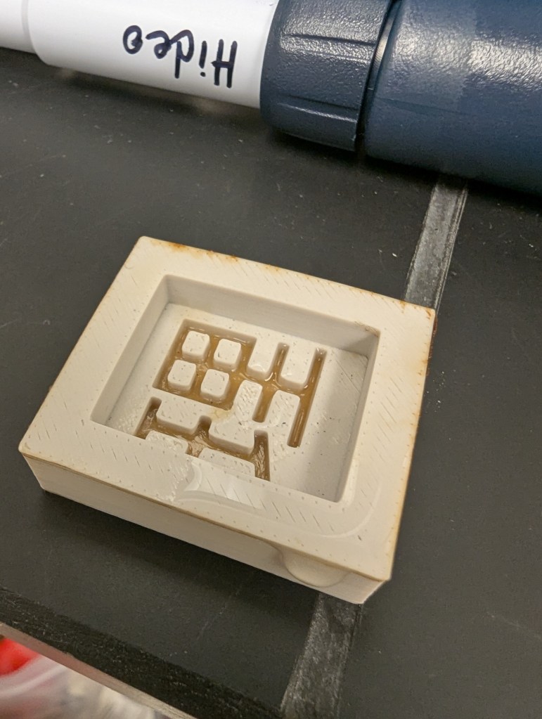 To do: 1) try indigo dyeing small chunks of “expired” SF hydrogel and then packing them into PLA voids; let dry and see; 2) make a test 3D-print for an MeOH reaction cell along the lines of 3 Oct 2024 – plan on applying double-sided adhesive and then exacto-cutting outlines? try this with concentrated SF solution…