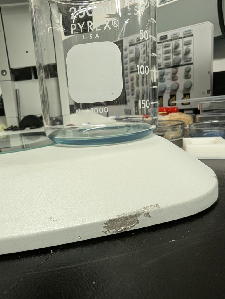 - Pour out remaining 0.5MeO and place whole thing in beaker of DI water & stir plate ~4pm Saturday; refresh DI water ~2pm Sunday
