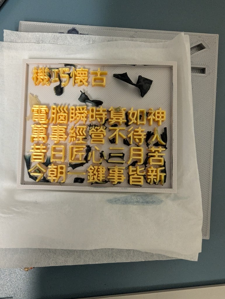 - Or could print gold PLA letters positive in white PLA “tray” then cast dyed SF film as the “paper” background