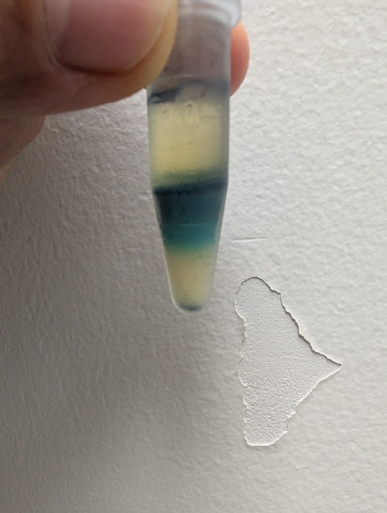 - 20 Sep after settling undisturbed for a few days there seem to be two phases – took cell phone photo. Can this be used to make indigo thin films? Should I push it through a syringe filter, dry out, and then resuspend in ethanol perhaps?
